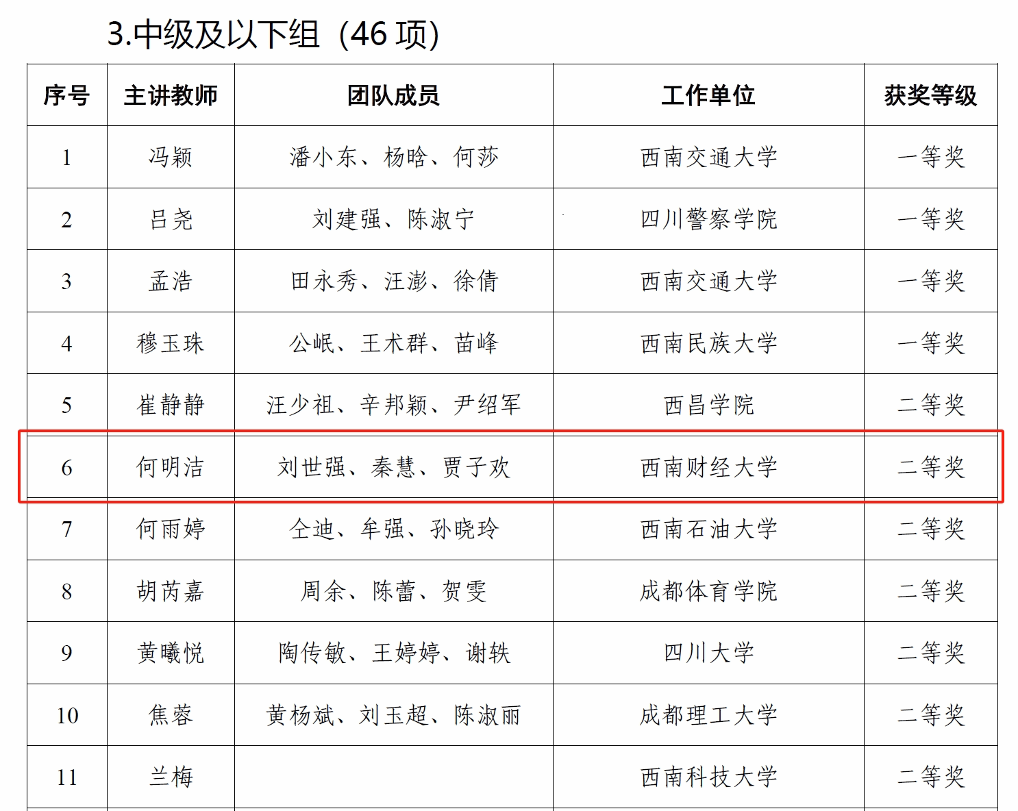 最终,经课堂教学实录视频、教学创新成果报告、教学设计创新汇报三大版块的激烈比拼,本次大赛共评出个人(团队)一等奖21项、二等奖77项、三等奖103项,优秀组织奖12项。公司何明洁老师团队荣获大赛二等奖,这充分展现了西财思政课教师创新的教学理念、扎实的教学功底、良好的精神风貌。